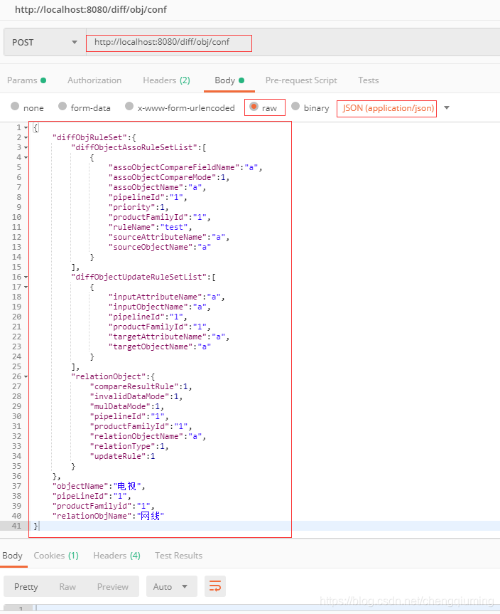 @PostMapping("/conf")public void diffObjAssoObjConf(@RequestBody ReqDiffObjRuleSet reqDiffObjRuleSet){ Result result = new Result(); System.out.println(reqDiffObjRuleSet);} 六 PostMan测试